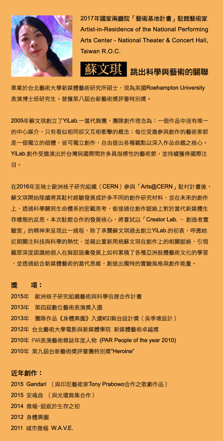 國家兩廳院「藝術基地計畫」駐館藝術家(2017年)蘇文琪簡介